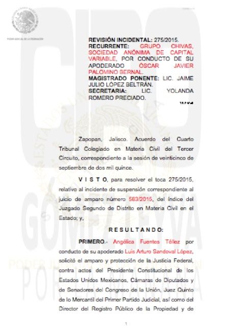 En el programa de Ciro Gómez Leyva en Radio Fórmula, se informó que, de acuerdo con el tribunal, Jorge Vergara, dueño del Club Guadalajara y Grupo Omnilife, cometió el error de no pedir frente a un Juzgado que fuera invalidada la asamblea del pasado 6 de febrero de 2015, durante la cual se nombró a Angélica Fuentes como administradora de Grupo Chivas.