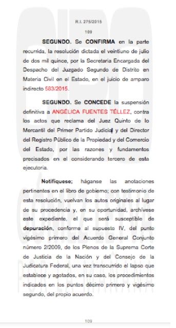 “Se concede la suspensión definitiva contra Angélica Fuentes Téllez contra los actos que reclama el Juez Quinto de lo Mercantil de Primer Partido Judicial y del director del Registro Público de la Propiedad y de Comercio del Estado, por las razones y fundamentos precisados en el considerando tercero de esta ejecutoria”, estableció el fallo del Cuarto Tribunal Colegiado en Materia Civil de Jalisco.