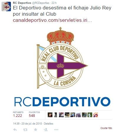 El Real Club Deportivo, que había anunciado el fichaje de Julio Rey a media tarde después de que el jugador hubiese firmado el contrato que lo vinculaba con la entidad blanquiazul, ha decidido no completar el acuerdo tras analizar los desafortunados comentarios vertidos por el jugador en un perfil personal en las redes sociales años atrás.