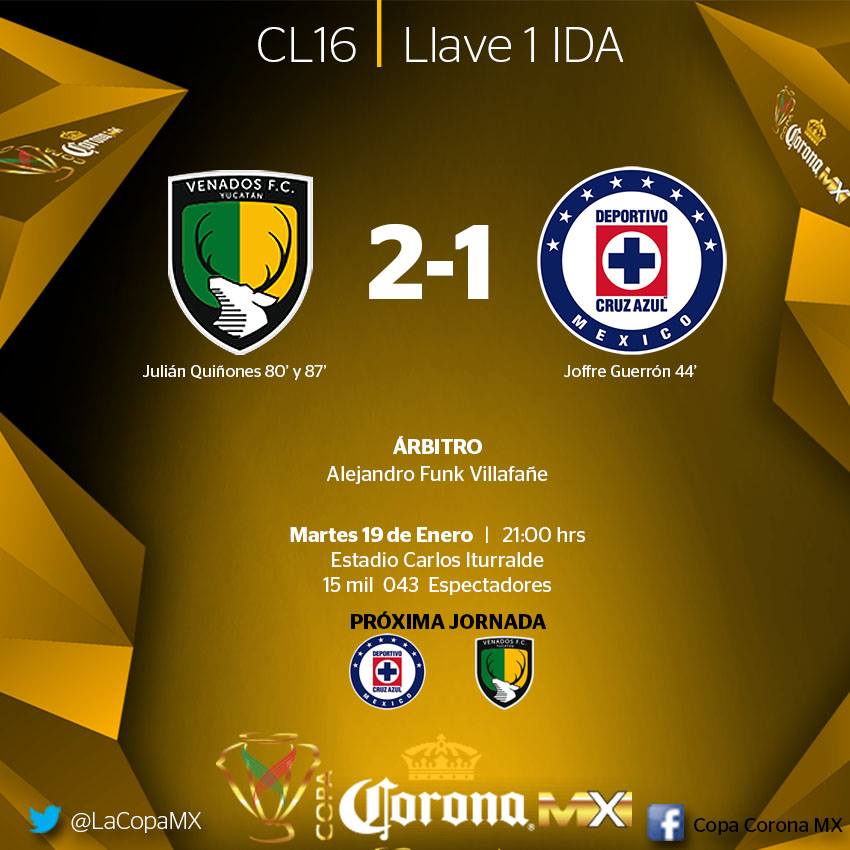 Cruz Azul cayó 1-2 ante Venados de Mérida, en partido de ida de la Llave 1 de la Copa MX Clausura 2016, disputado en el Estadio Carlos Iturralde. Pese a que La Máquina se puso adelante en el marcador 1-0 con tiro penal de Joffre Guerrón, en el minuto 43 -lo que significa la primera anotación del ecuatoriano con … Continued