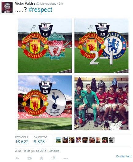 Tras las declaraciones, Valdés contestó hoy al que todavía es su entrenador con un tuit. Se trata de cuatro fotografías en donde se le ve con compañeros del equipo sub-21 del Manchester United y con compañeros suplentes. Las imágenes solo están acompañados por puntos suspensivos, un signo de interrogación y la etiqueta #respect.