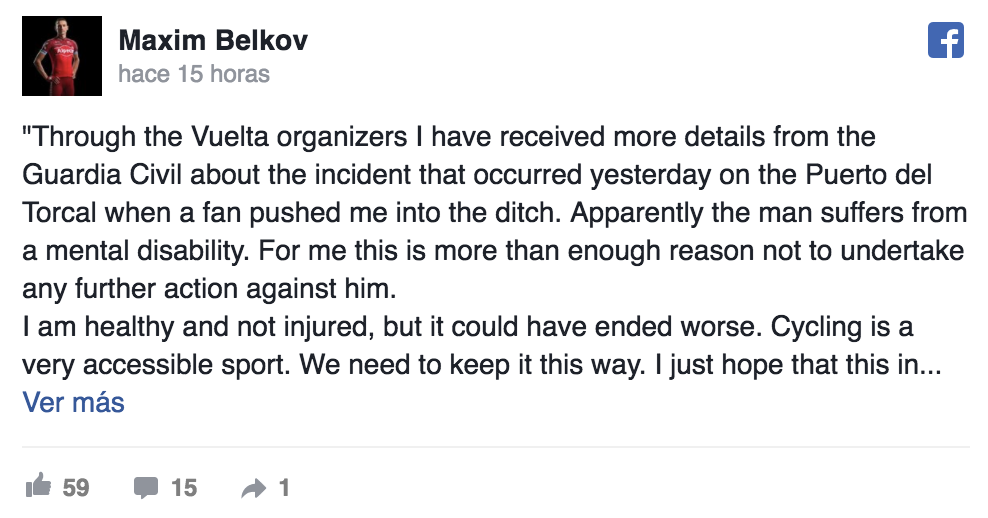 Luego de lo sucedido Belkov escribió en su Facebook: “Hoy (viernes), en la ronda 12 de La Vuelta fui derribado de mi bicicleta por un ‘fan’ en una playera roja. Volé por encima de la valla y me caí en una duna; quizás alguien tenga algún video de lo ocurrido”.