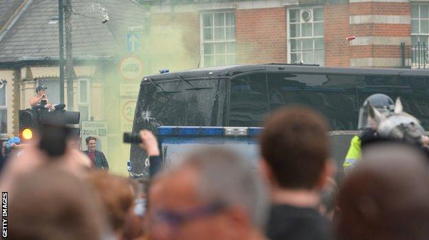 Los seguidores del conjunto local, que ya habían superado los esfuerzos policiacos desde antes de que llegara el camión del United, recibieron con hostilidad al cuadro visitante, lanzando una gran cantidad de objetos, principalmente botellas y latas de cerveza.