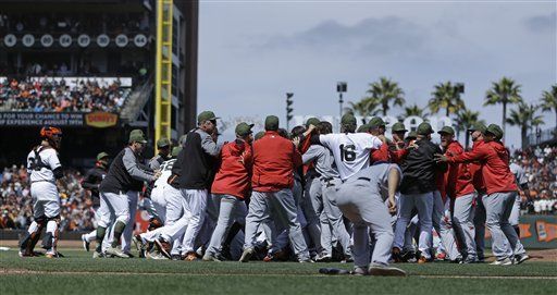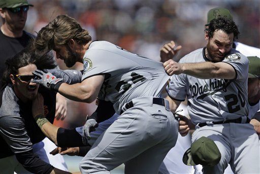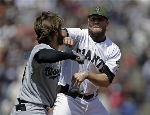 Michael Morse y Jeff Samardzija, de los Gigantes, se llevaron un duro encontronazo mientras trataban de separar a los rijosos. A tirones y empellones, tres jugadores de los Gigantes se llevaron a Strickland hasta la cueva. Harper fue contenido por un compañero.