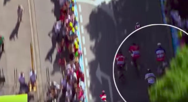 Una cuadrilla de primeros auxilios corrió en sentido contrario a los ciclistas que se acercaban, para atender a Cavendish.