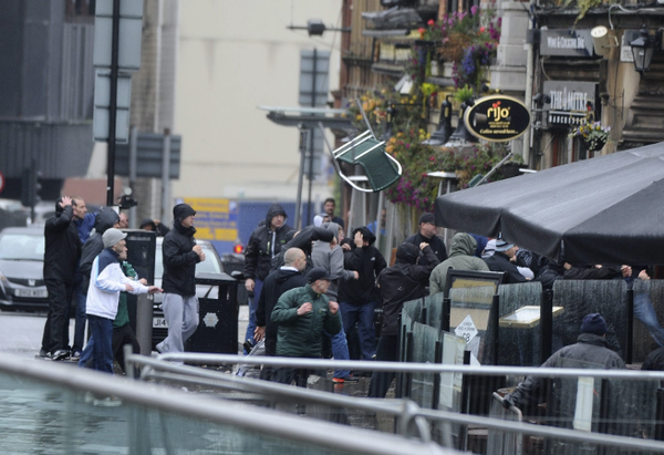 Los aficionados de ambos clubes se lanzaron sillas, botellas y otros objetos en el enfrentamiento que dejó un herido por parte de los españoles y dos ingleses detenidos.