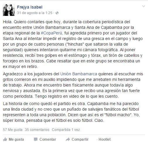 Durante un partido entre los clubes de Unión Bambamarca y Santa Ana de Cajabamba de la Copa Perú, se suscitó una pelea entre los jugadores quienes terminaron agredieron a la reportera Cintya Malpartida Guarniz quien tomaba fotos y videos el juego.