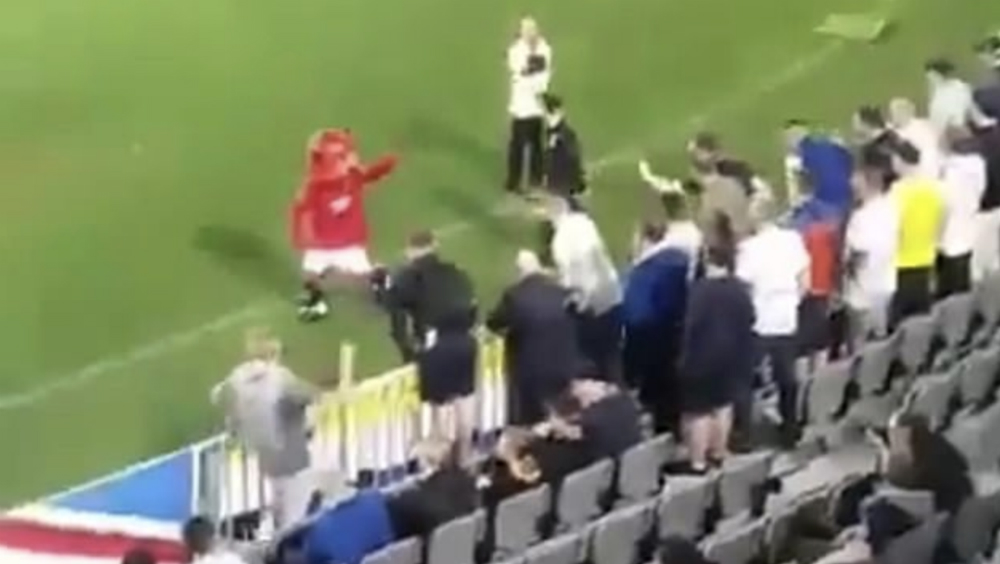 Antes del juego, la mascota del Manchester United se inclinó y movió su trasero frente a un grupo de aficionados del Leeds, lo que provocó el enojo.
