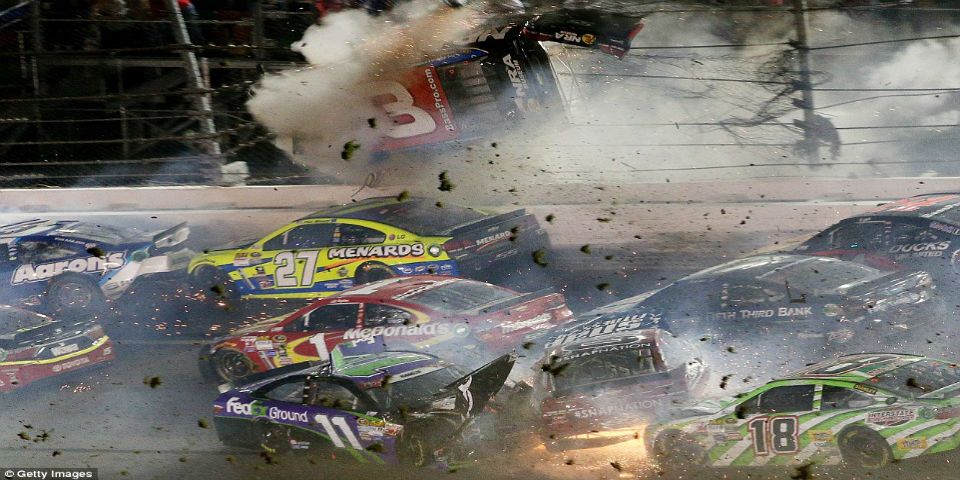 El accidente empezó en los minutos finales de la carrera, cuando los pilotos competían por el mejor puesto detrás del líder. Kevin Harvick hizo un pequeño contacto con Denny Hamlin en la parte interna de la pista, haciendo que su coche girara. Hamlin a su vez chocó con el coche de Dillon, que viajaba a toda velocidad, lanzándolo por los aires hasta las rejas de protección.