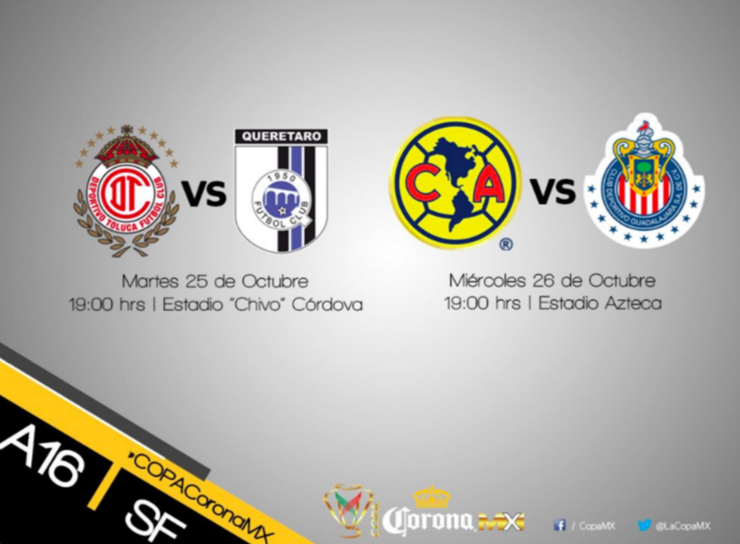 Las semifinales de la Copa MX ya están listas. El Toluca recibirá al Querétaro el próximo martes 25 de octubre en el Estadio “Chivo” Córdova y las Chivas visitarán el Estadio Azteca para enfrentar al América el miércoles 26 de octubre.
