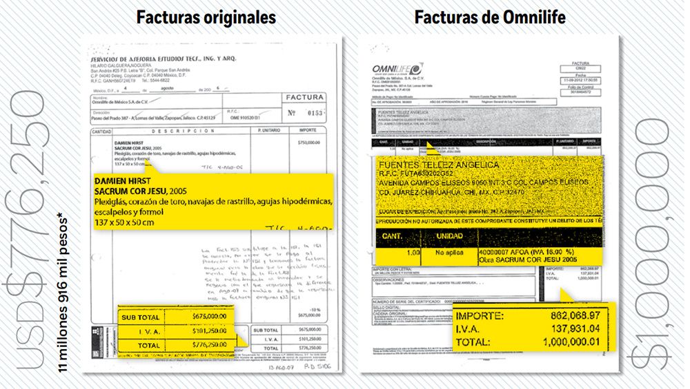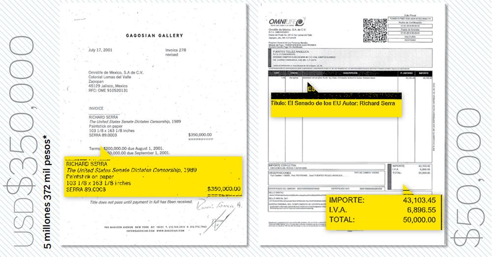 Las obras presuntamente adquiridas de manera fraudulenta son: The United Senate Dictates Censorship (1989), de Richard Serra; Green Paper (1991), de Gabriel Orozco; y Sacrum Cor Jesu (2005), de Damien Hirst. Las tres fueron adquiridas por Grupo Omnilife entre 2001 y 2008.