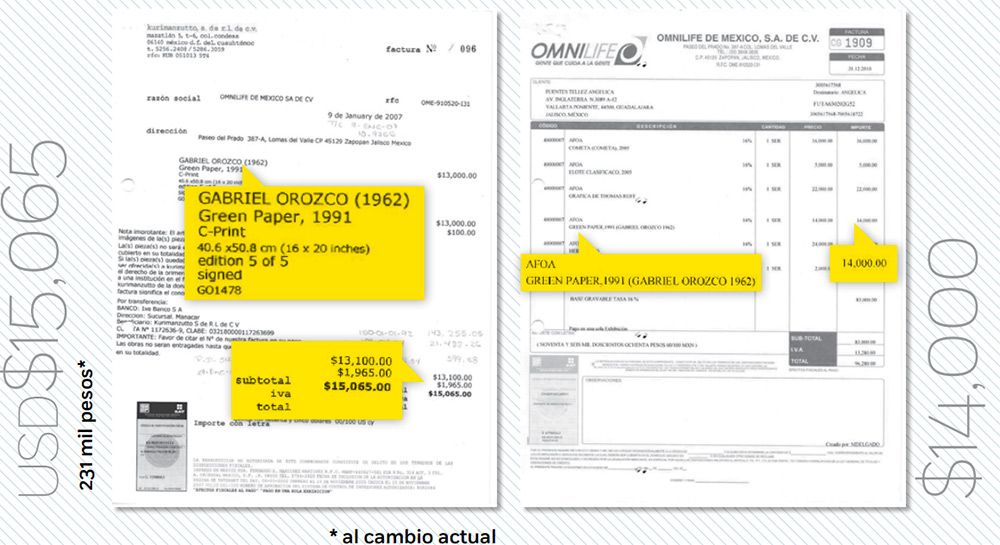 La primera fue comprada a la galería neoyorquina Gagosian Gallery por 350 mil dólares en 2001, y el año pasado Fuentes la adquirió en solo 50 mil pesos. Por la segunda, la empresa pagó 15 mil 65 dólares en 2007 a la galería Kurimanzutto, y en 2010 la empresaria se la adjudicó en 14 mil pesos.