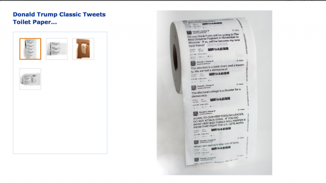 El gigante de ventas por internet, Amazon, ha decidido vender unos singulares rollos de papel higiénico, los cuales tiene como característica principal el llevar impresos varios de los tuits publicados por el presidente de los Estados Unidos, Donald Trump.