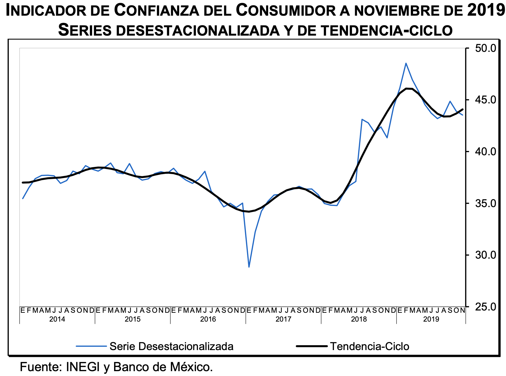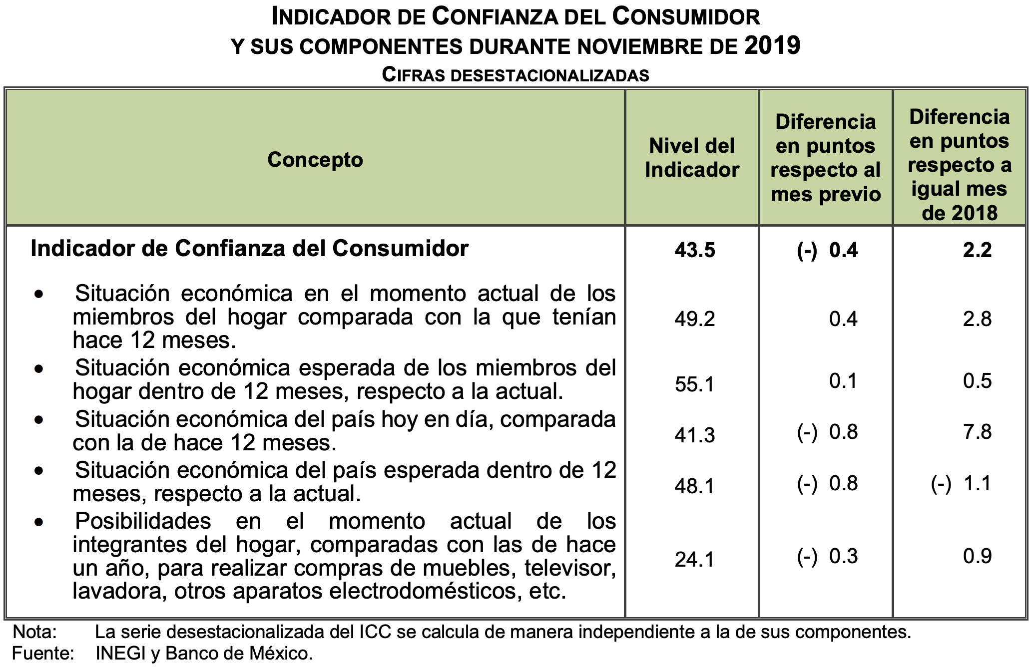 En noviembre de 2019, el Indicador de Confianza del Consumidor (ICC) elaborado de manera conjunta por el INEGI y el Banco de México, mostró una disminución mensual de 0.4 puntos en términos desestacionalizados.