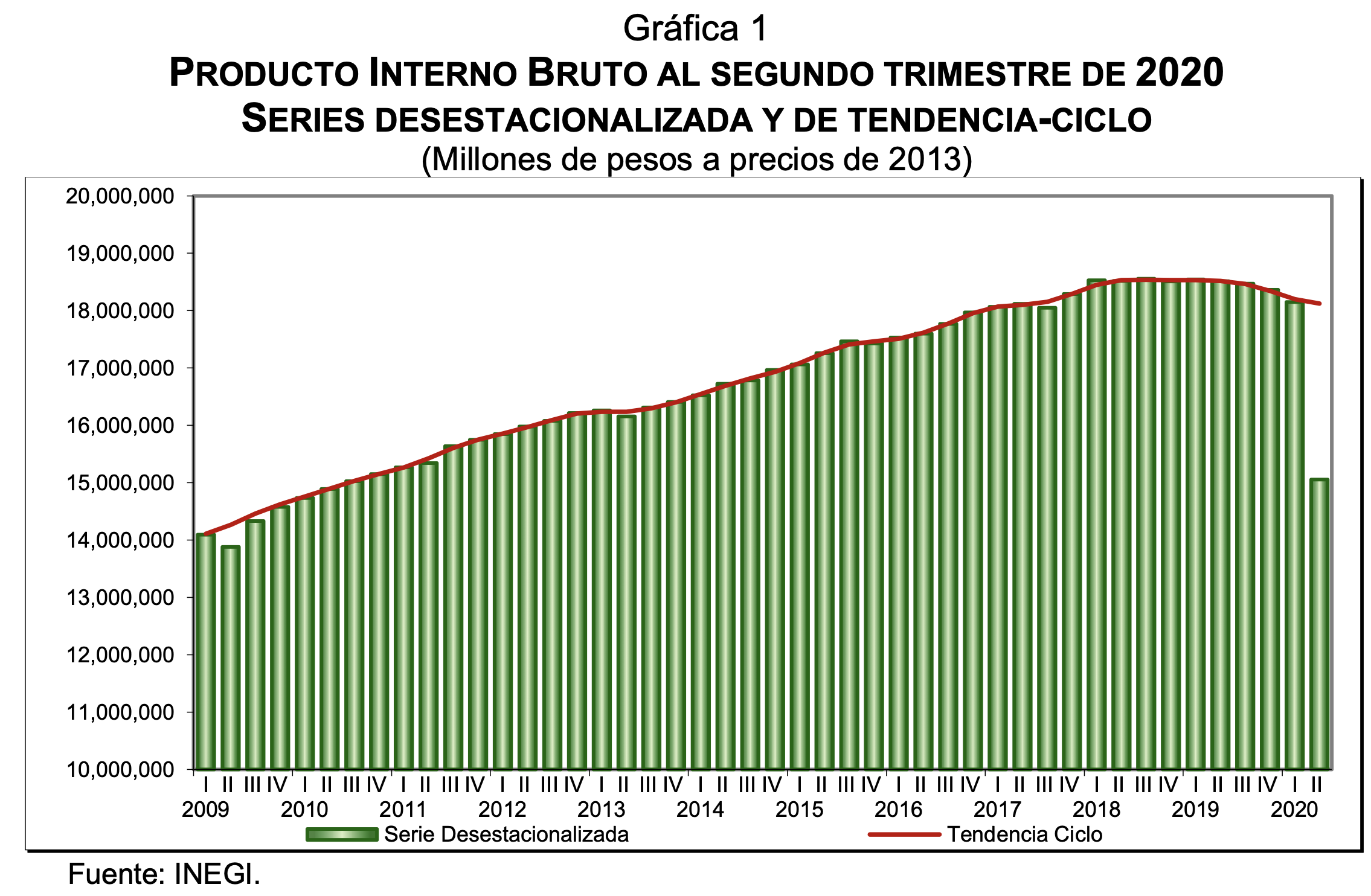 El PIB durante el segundo trimestre de 2020 el PIB disminuyó 17.1 por ciento en términos reales; supera las caídas de 2009 y 2005
