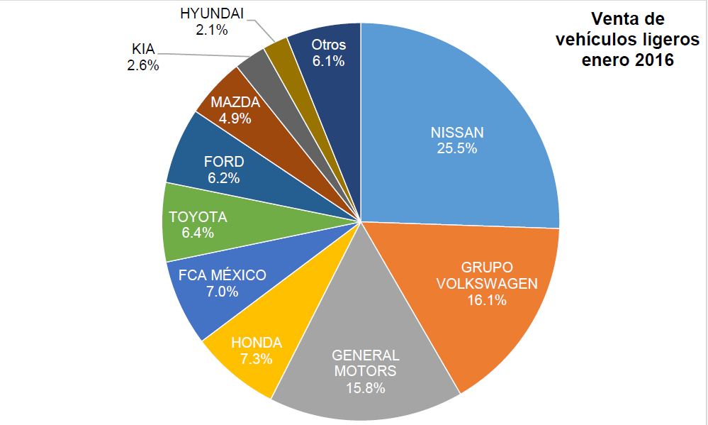 La marca Nissan, con un 25.5 por ciento, fue la que más vehículos vendió en nuestro país en enero de 2016. Le siguió Volkswagen (16.1 por ciento) y General Motors (15.8 por ciento).