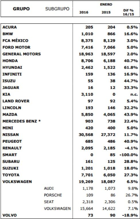 Cifras de venta de vehículos en enero de 2016 marcan un incremento de 15.4 por ciento con respecto a cifras del mismo mes en 2015