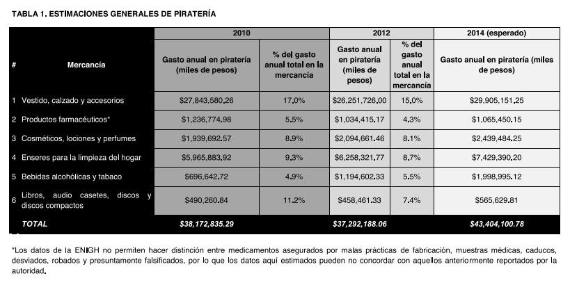 De acuerdo al reporte realizado por la organización, el mercado de la piratería en 2013 costó al país más de 43 mil millones de pesos, el equivalente al 34 por ciento del recorte presupuestal de 2015.