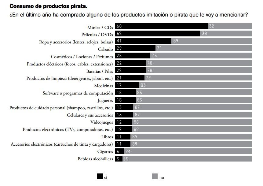 En el reporte publicado por el CIDAC se detalla la encuesta realizada en mil 500 hogares mexicanos en los cuales resultó la música y películas como los productos más pirateados, con un 68 por ciento de los mexicanos que admitió haber comprado estos productos.