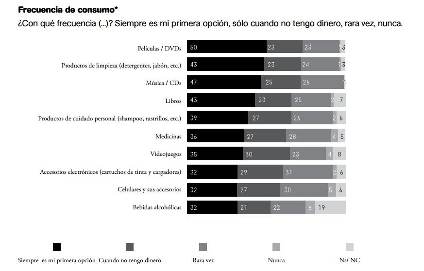 Acorde a la encuesta al menos el 50 por ciento de los mexicanos aseguró que comprar películas piratas es su primera opción, mientras que el 47 por ciento aseguró lo mismo pero para CD’s y un 43 por ciento para productos de limpieza.