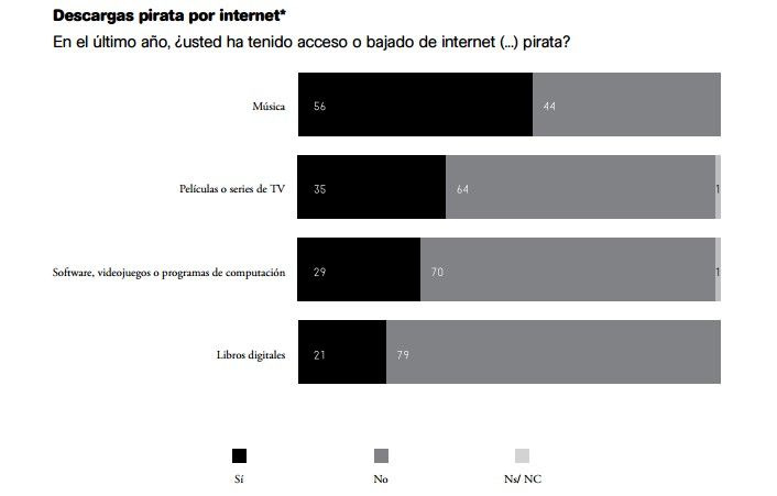 En cuento a las cifras en internet, el 56 por ciento de los encuestados reconoció haber bajado música ilegalmente al menos una vez al mes, y que de este consumo de piratería por internet, al menos el 50 por ciento lo realizó desde su casa.