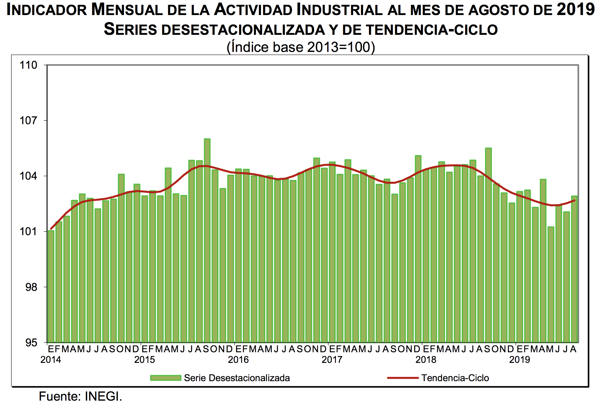El INEGI informó que el Indicador Mensual de la Actividad Industrial (IMAI) del país avanzó 0.8 por ciento en términos reales en el octavo mes del presente año respecto al del mes previo, con base en cifras desestacionalizadas.