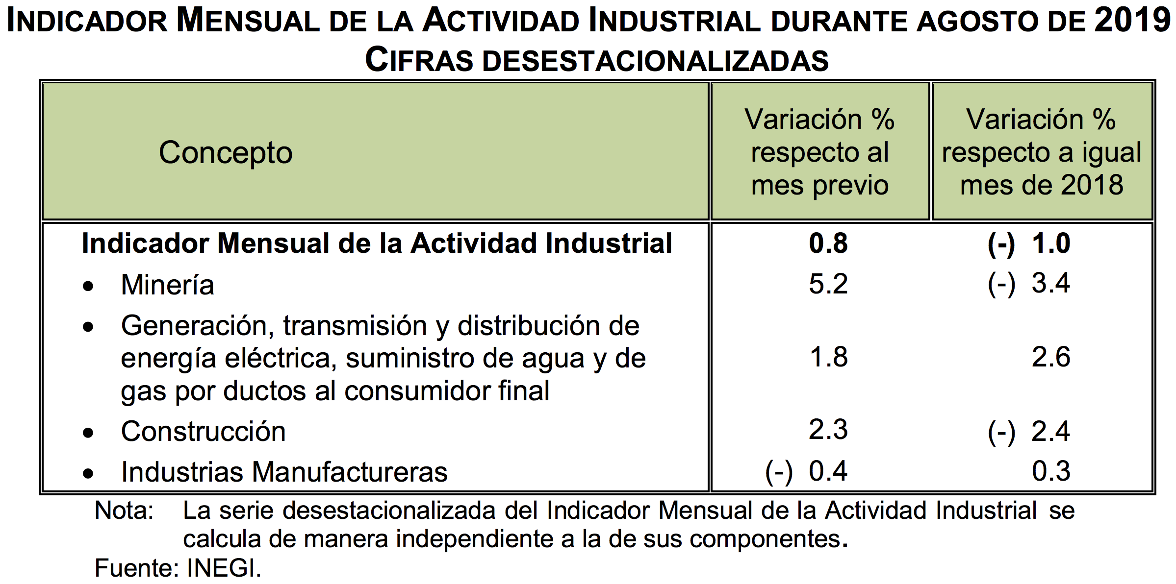 En su comparación anual, la Producción Industrial cayó 1 por ciento en el mes en cuestión. Por sectores de actividad económica, la Minería se redujo 3.4 por ciento y la Construcción 2.4 por ciento, mientras que la Generación, transmisión y distribución de energía eléctrica, suministro de agua y de gas por ductos al consumidor final se incrementó 2.6 por ciento y las Industrias manufactureras 0.3 por ciento con relación al mes de agosto de 2018.