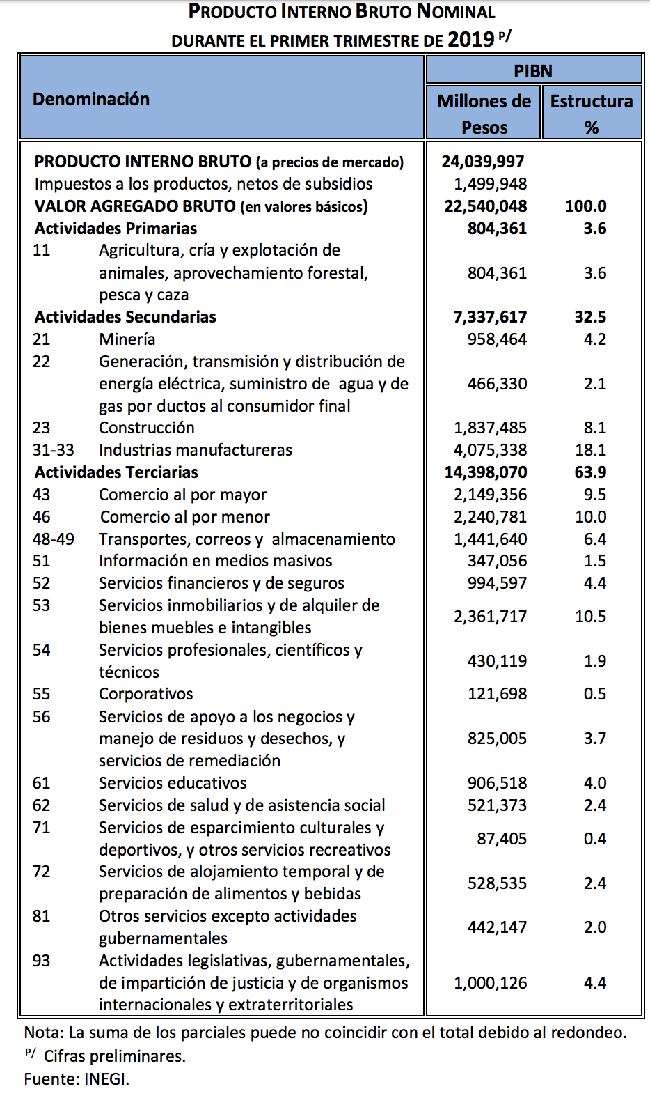 A través de un comunicado, informó que el Producto Interno Bruto Nominal (PIBN) a precios de mercado se situó en 24,039,997 millones de pesos (mp) corrientes (24.040 billones de pesos) en el primer trimestre de 2019, presentando un aumento de 6.3% con relación a igual lapso de 2018.