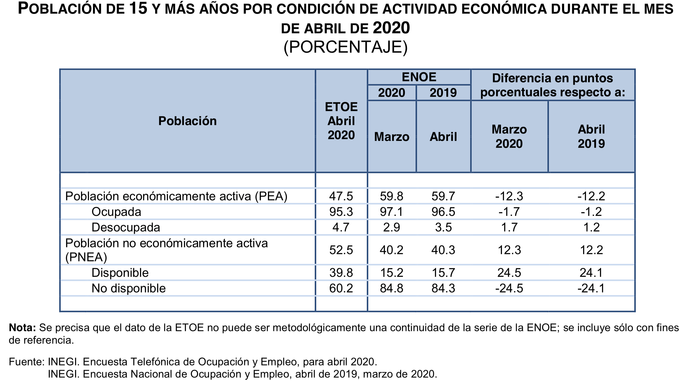 El Instituto Nacional de Estadística y Geografía (INEGI) informó los resultados de la primera Encuesta Telefónica de Ocupación y Empleo (ETOE) levantada en abril de 2020.