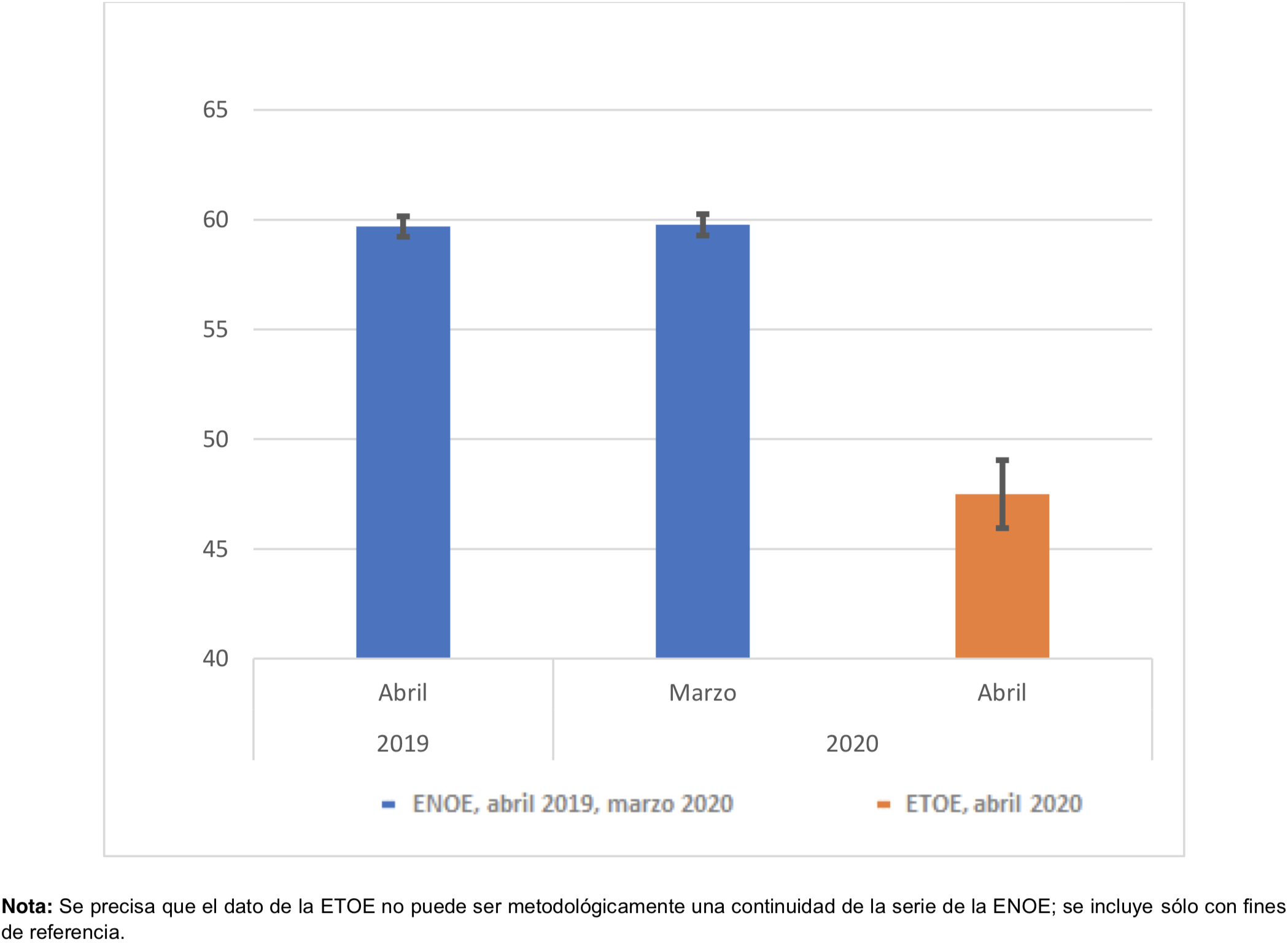 La ETOE reportó que la Tasa de Participación Económica en abril de 2020 fue del 47.5 por ciento respecto a la población de 15 años y más, cifra inferior en 12.3 puntos porcentuales a la de marzo del mismo año.