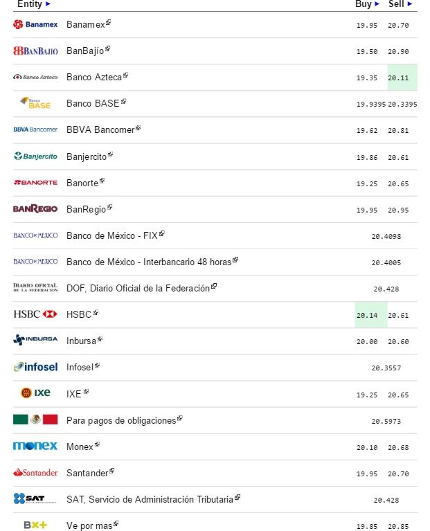 El euro, por su parte, se vendió en un precio máximo de 21.62 pesos, 16 centavos abajo respecto a la sesión anterior; mientras que la libra esterlina se ofertó en 25.70 pesos y el yen hasta en 0.202 pesos por unidad.