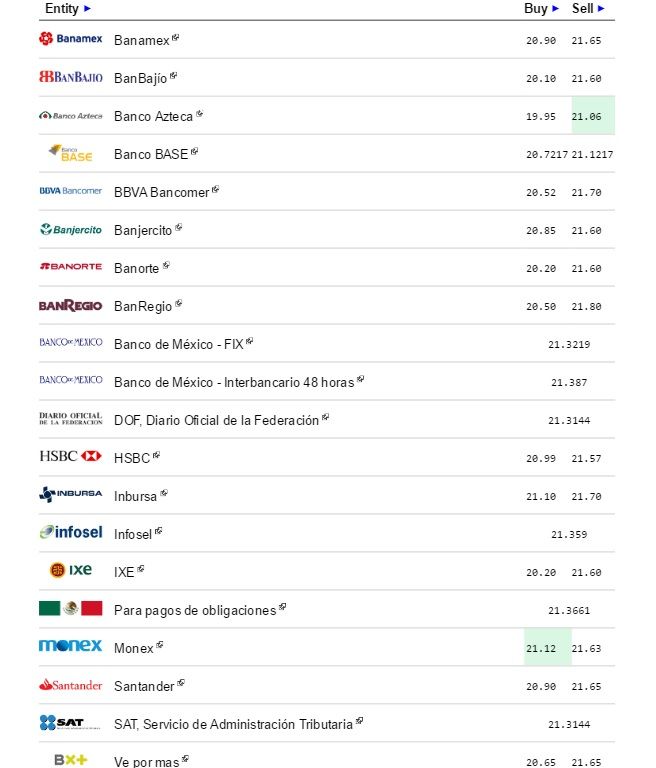 El Banco de México (Banxico) informó que el tipo de cambio para solventar obligaciones denominadas en moneda extranjera pagaderas en el país es de 21.3219 pesos.