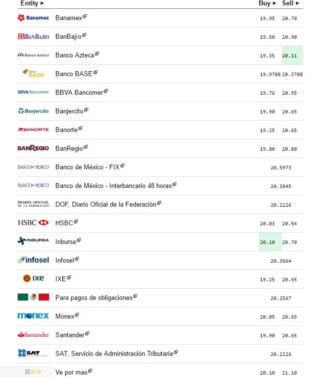 Bancos de la capital del país vendieron el dólar libre en un precio máximo de 20.77 pesos, 19 centavos más en comparación con el cierre previo, y lo compraron en un mínimo de 19.58 pesos.