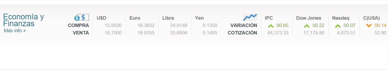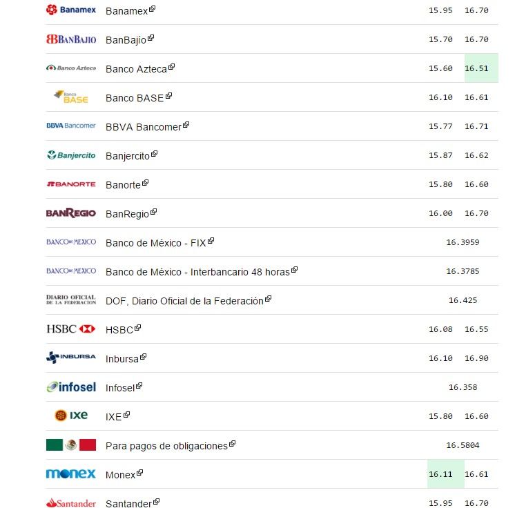 Este viernes, en la última sesión cambiaria de la semana, el dólar libre cerró en un máximo a la venta de 16.70 pesos en sucursales bancarias de la Ciudad de México, situación que representa un ascenso marginal de dos centavos respecto al cierre de ayer, y se compró en un mínimo de 15.79 pesos.