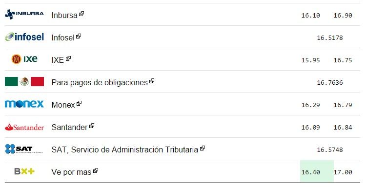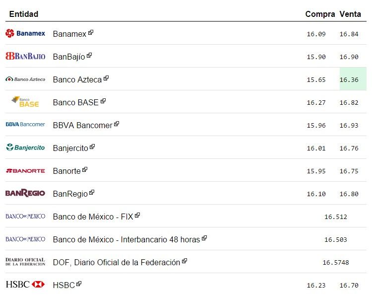 El Banco de México (Banxico) fijó el tipo de cambio para solventar obligaciones denominadas en moneda extranjera pagaderas en el país en 16.5120 pesos.
