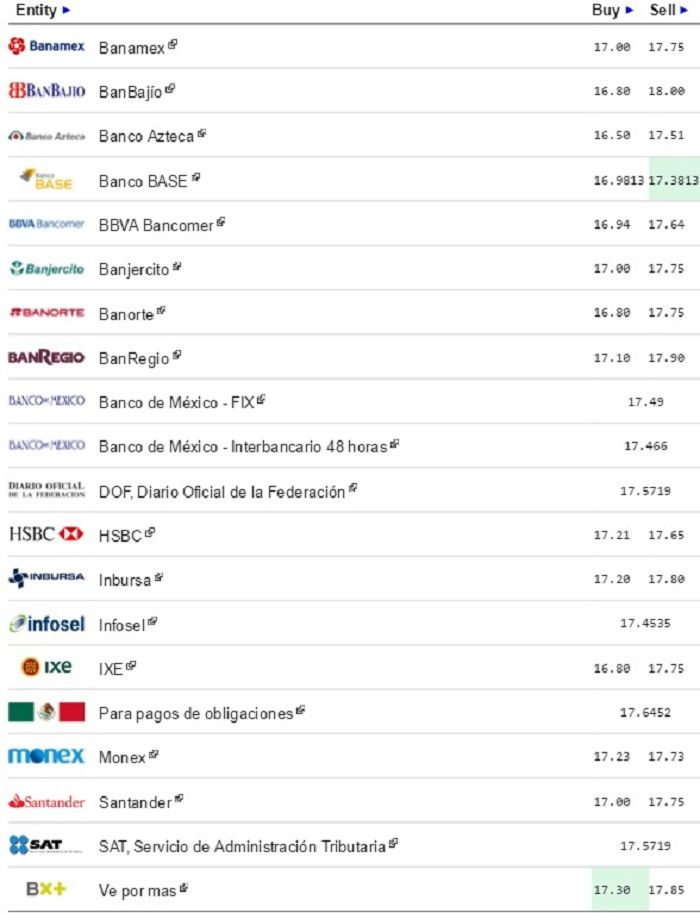 En tanto, que el menor precio a la compra es de 16.95 pesos al término de las operaciones cambiarias en bancos de la Ciudad de México.