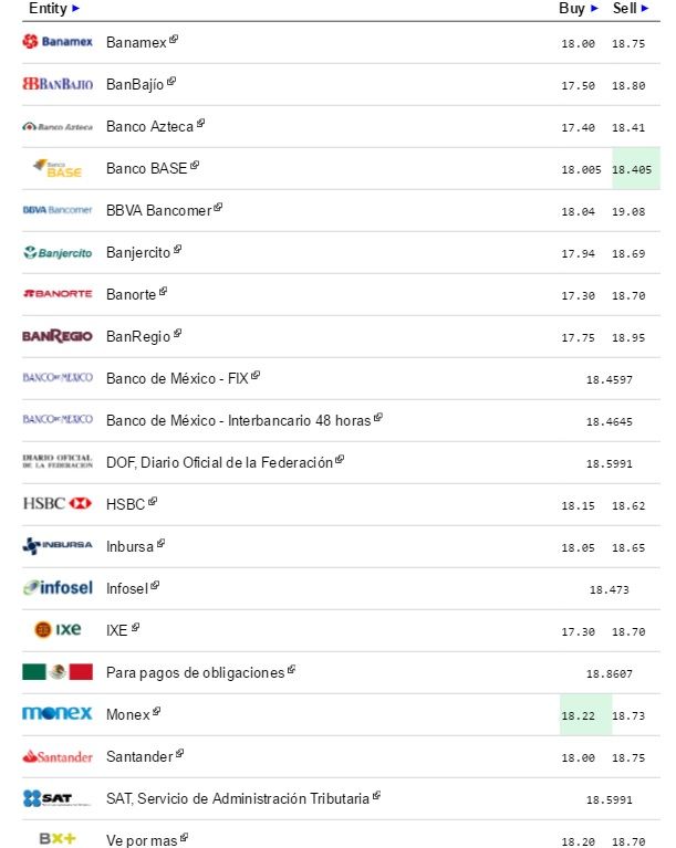 El euro, por su parte, se ofreció en un precio máximo de 20.69 pesos, dos centavos menos en comparación con el cierre de la jornada previa, mientras que la libra esterlina se ofreció en un precio máximo de 24.33 pesos y el yen hasta en 0.197 pesos por unidad.