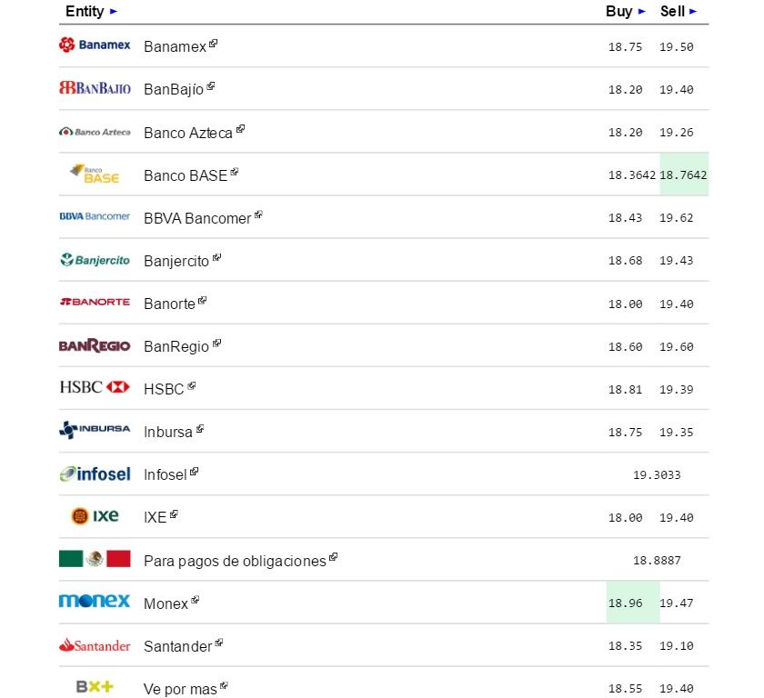 Al cierre de las operaciones cambiarias de este miércoles, el dólar libre se vendió en un precio máximo de 19.62 pesos, un centavo más respecto al cierre pasado, y se adquirió en 18.86 pesos en bancos de la Ciudad de México.