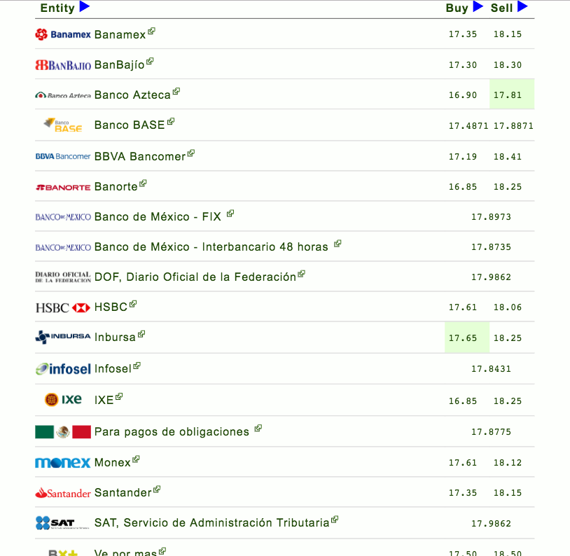 Este miércoles, el dólar libre se vendió en un precio máximo de 18.25 pesos, es decir, un retroceso de nueve centavos comparándolo con el cierre anterior, y se compró en un mínimo de 16.85 pesos en sucursales bancarias de la capital del país.