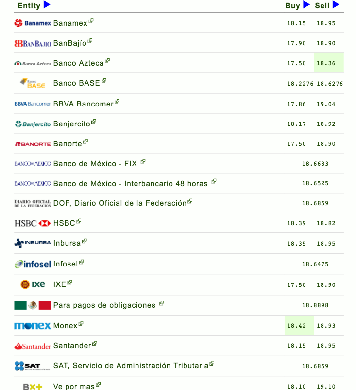 El dólar estadounidense se ofertó hasta en 19.03 pesos, con una variación al alza de cuatro centavos en comparación con el cierre del viernes anterior, y se adquirió en un precio mínimo de 17.50 pesos en sucursales bancarias de la capital del país.