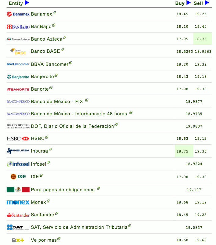 En bancos de la Ciudad de México, el dólar libre terminó la jornada con una cotización máxima de 19.39 pesos, nueve centavos menos que el cierre previo, y se compró en un precio mínimo de 17.90 pesos.