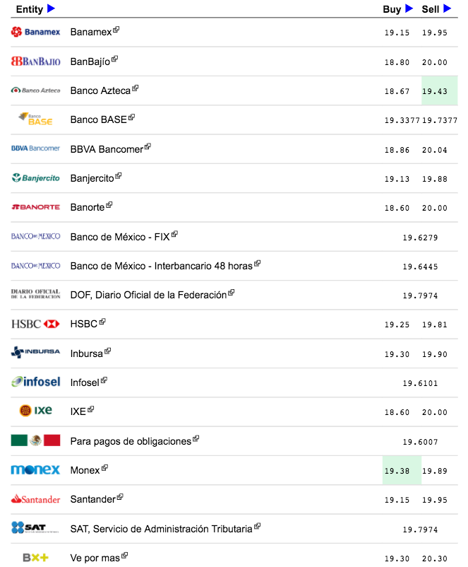 El dólar estadounidense terminó la semana hasta en 20.04 pesos, con una variación a la baja de 16 centavos frente al peso, respecto a su cierre de ayer, y se compra en un mínimo de 18.60 pesos en sucursales bancarias de la capital mexicana.