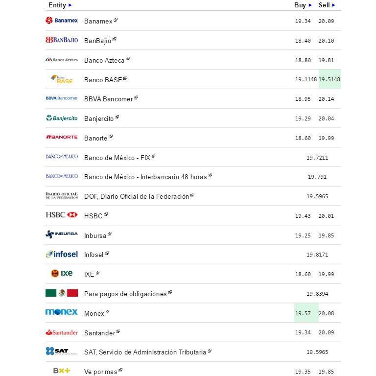 Sucursales bancarias de la Ciudad de México ofrecieron el dólar libre hasta en 20.14 pesos, ocho centavos más respecto al cierre de la sesión cambiaria de la víspera, y lo compraron en un mínimo de 19.01 pesos.