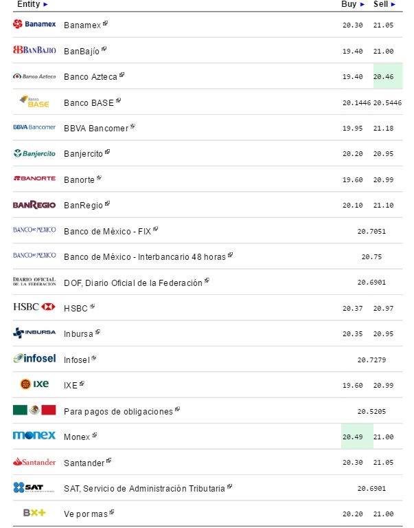 El euro, a su vez, se ofertó en 22.33 pesos, 10 centavos más frente a la víspera; mientras que la libra esterlina se ofreció en un precio máximo de 26.28 pesos y el yen hasta en 0.212 pesos por unidad.