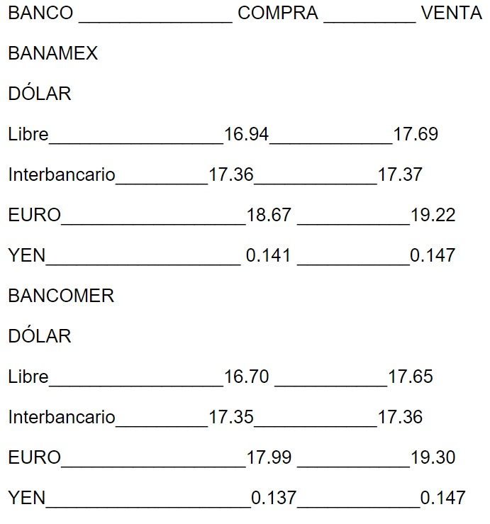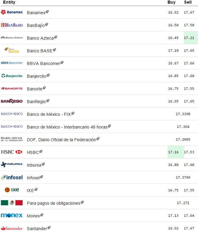 El Banco de México (Banxico) fijo el tipo de cambio para solventar obligaciones en moneda extranjera pagaderas en el país en 17.3398 pesos.