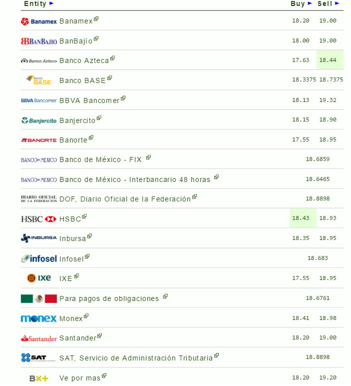 Al cierre de las operaciones cambiarias en bancos de la Ciudad de México, el dólar estadounidense se ofreció hasta en 19 pesos, lo que representó un retroceso de 32 centavos respecto al cierre del jueves, y se compró en un precio mínimo de 17.55.