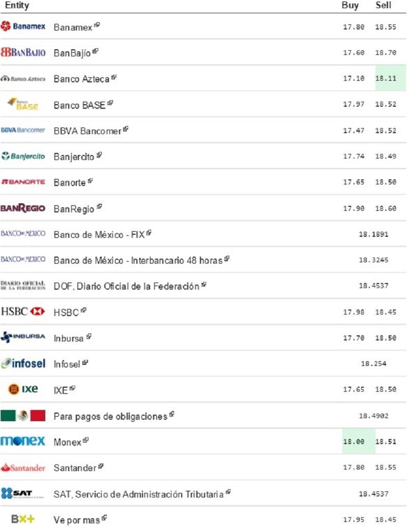 El Banco de México (Banxico) fijó el tipo de cambio para solventar obligaciones en moneda extranjera pagaderas en el país en 18.1891 pesos.