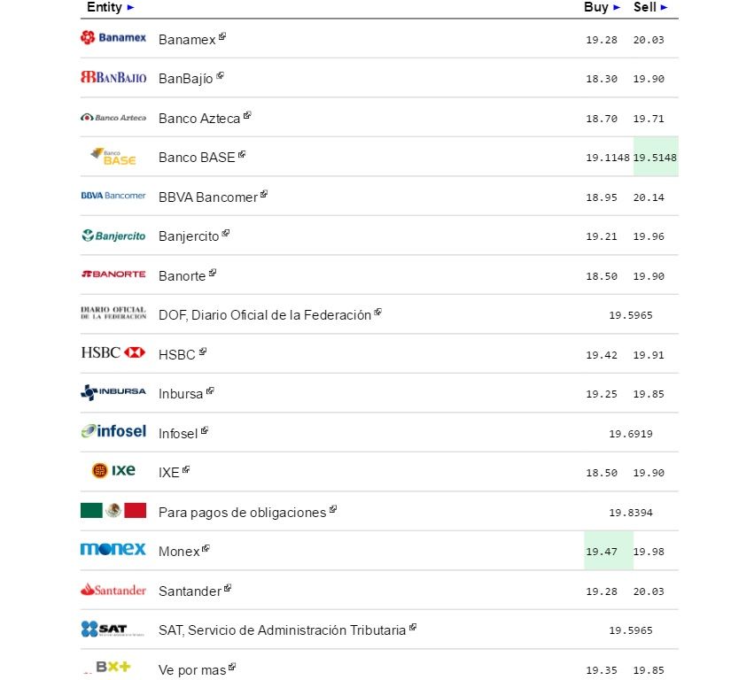El Banco de México (Banxico) informó en el Diario Oficial de la Federación (DOF) que el tipo de cambio para solventar obligaciones denominadas en moneda extranjera pagaderas en el país es de 19.5965 pesos.