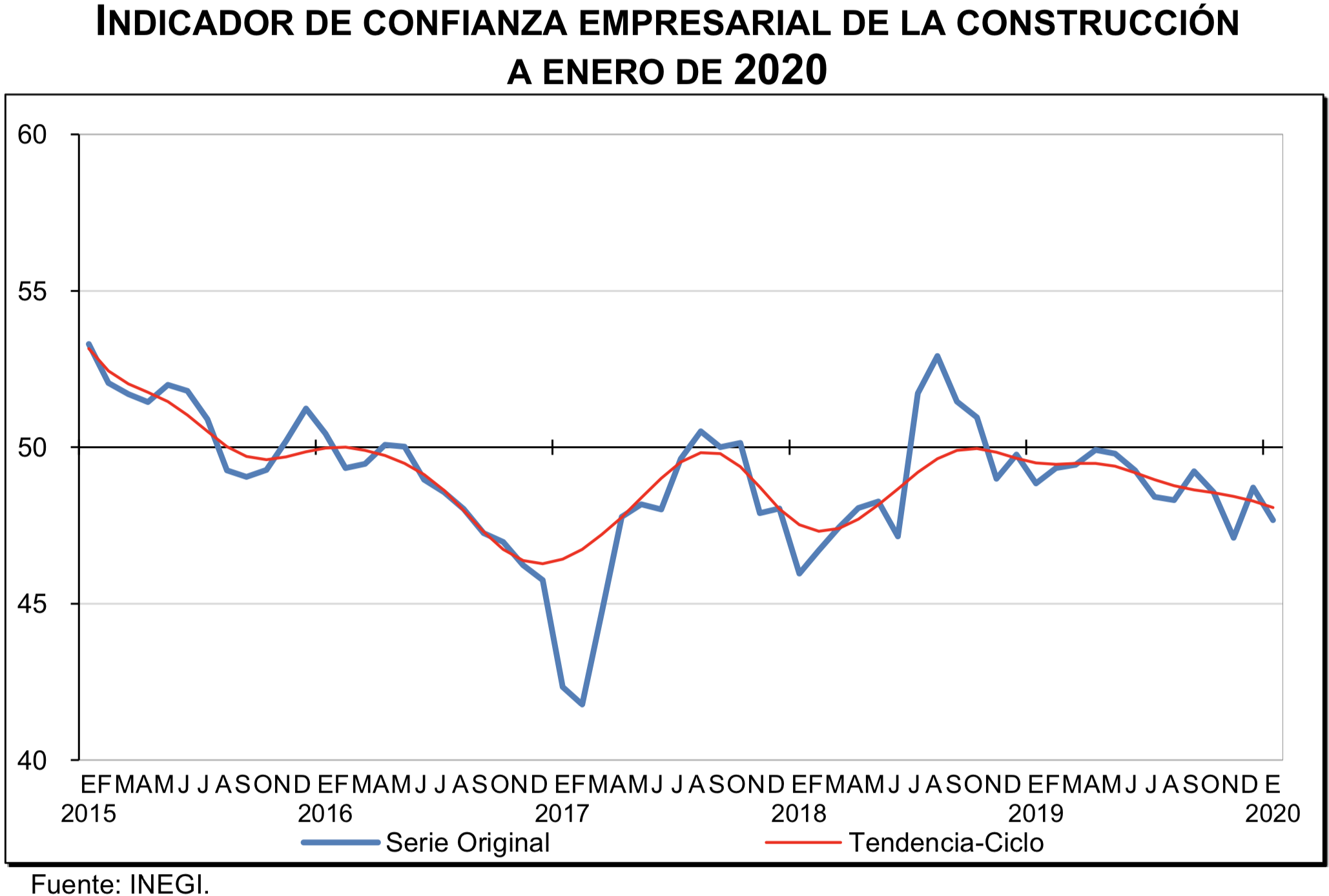 Indicador de Confianza Empresarial de la Construcción a Enero de 2020. Datos de INEGI.