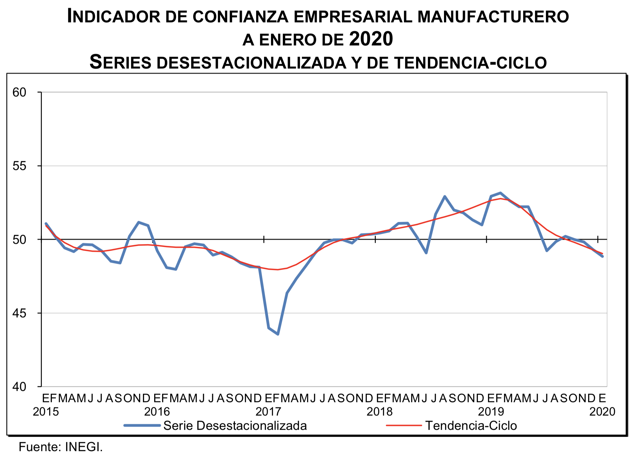 Indicador de Confianza Empresarial Manufacturero a enero de 2020. Series desestacionalizada y de tendencia-ciclo. Datos de INEGI.